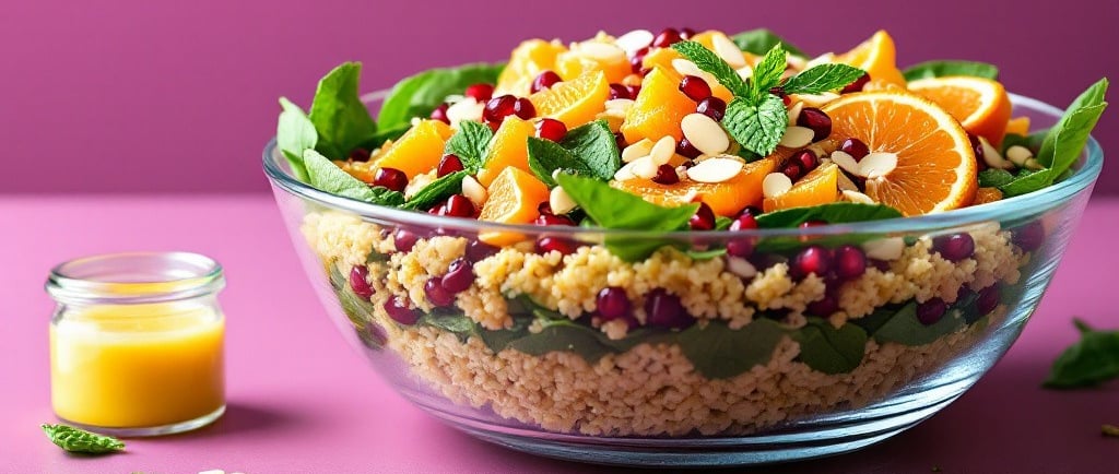 Una ensalada colorida y refrescante que combina la suavidad de la quinoa con la jugosidad de los cítricos, el toque crujiente de las almendras y el frescor de la menta. Perfecta para revitalizarte en días cálidos, llena de color, sabor y beneficios para el cuerpo.