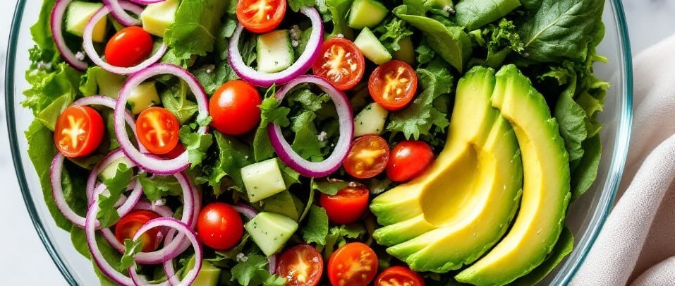 Una ensalada colorida y refrescante con vegetales crujientes, aguacate cremoso y un aderezo de yogur griego con cilantro y ajo que eleva cada bocado. Ideal como plato principal ligero o acompañante.