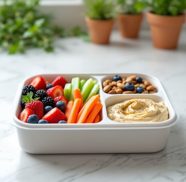 Lleno de deliciosas frutas, vegetales crujientes, hummus rico en proteínas y un puñado de nueces, ¡este bento box es el snack perfecto para llevar!