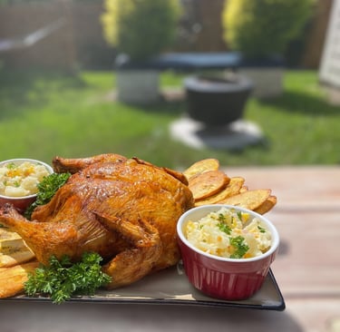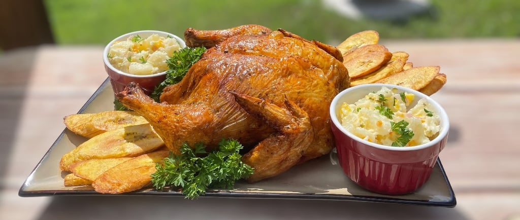 Un pollo entero, sazonado con un marinado tradicional boricua a base de ajo, adobo y orégano, asado hasta obtener una piel dorada con carne jugosa y llena de sabor. Este plato es ideal para celebraciones familiares o como centro de una comida memorable.