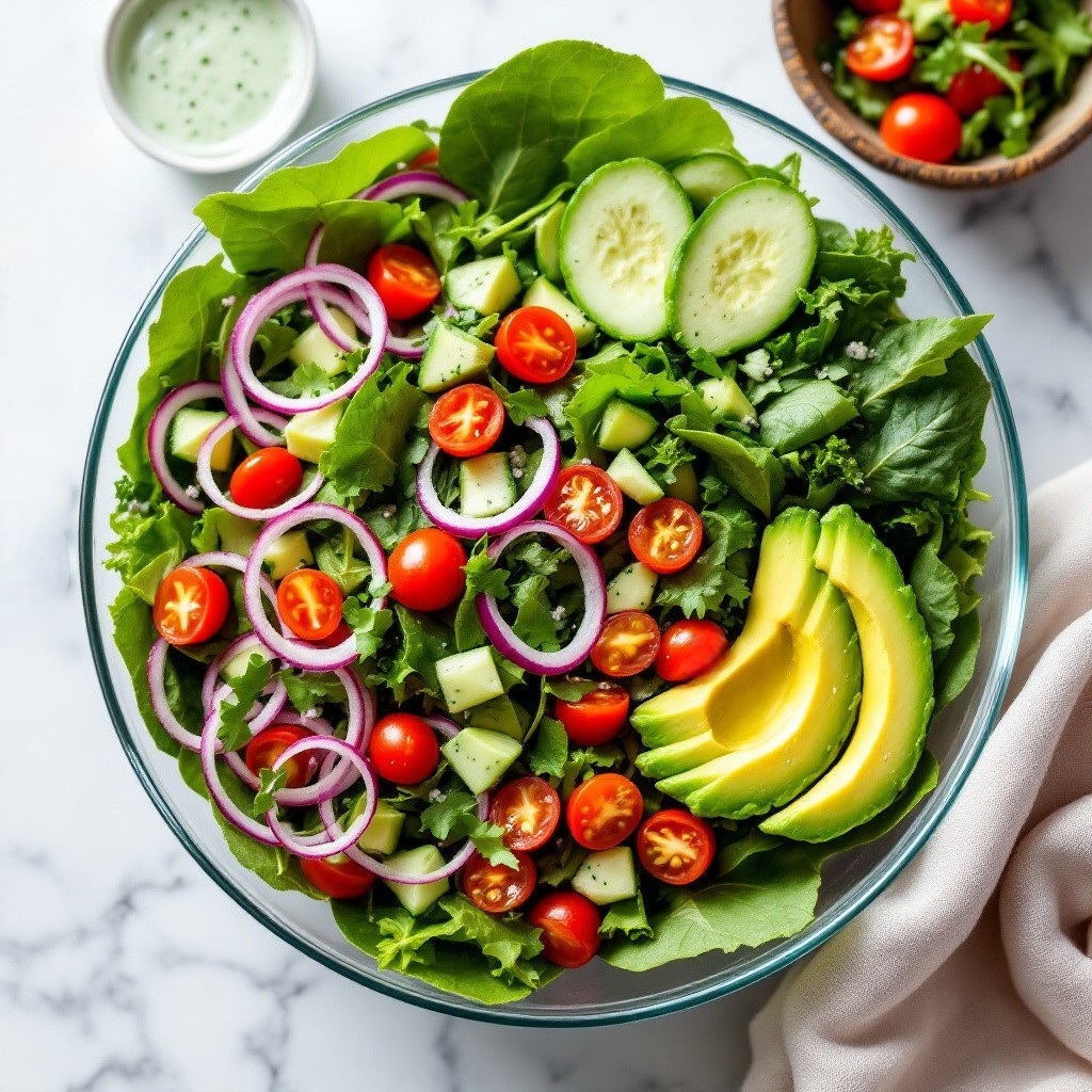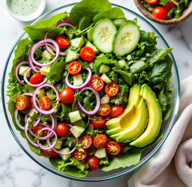 A colorful and refreshing salad with crunchy vegetables, creamy avocado, and a cilantro-garlic Greek yogurt dressing that elevates every bite. Ideal as a light main dish or side dish.