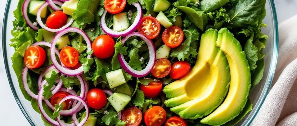In a large bowl, combine the greens, cucumber, onion, avocado (if using), and cherry tomatoes.
