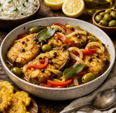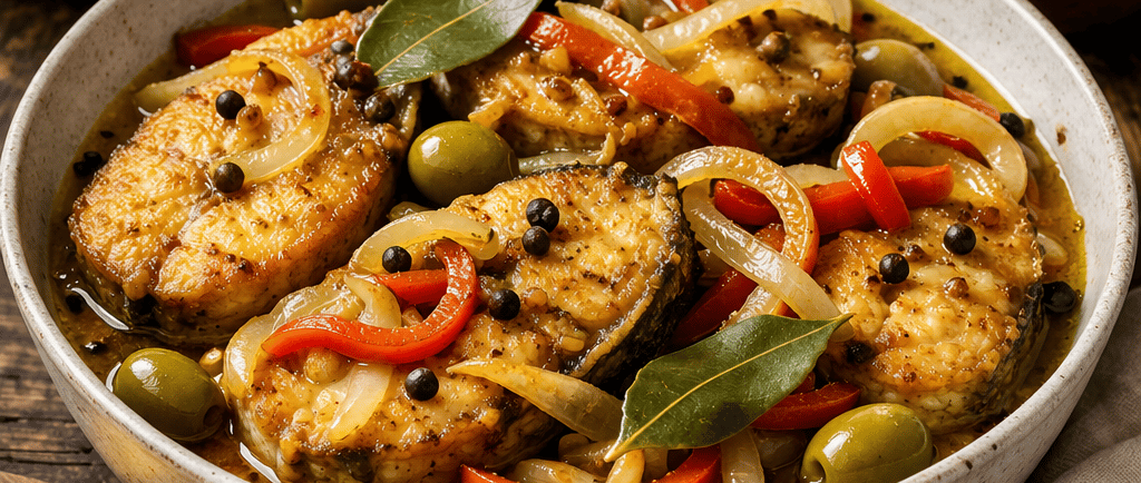 Traditional pickled fish (escabeche) made with vinegar, olive oil, spices, and vegetables. It is an aromatic, make-ahead dish rich in history and flavor.