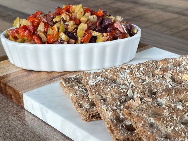 This recipe features healthy fats from olives and cold-pressed olive oil, which are rich in antioxidants and support heart health. Capers and green peppercorn add a boost of flavor with minimal calories, and red bell peppers contribute vitamin C.